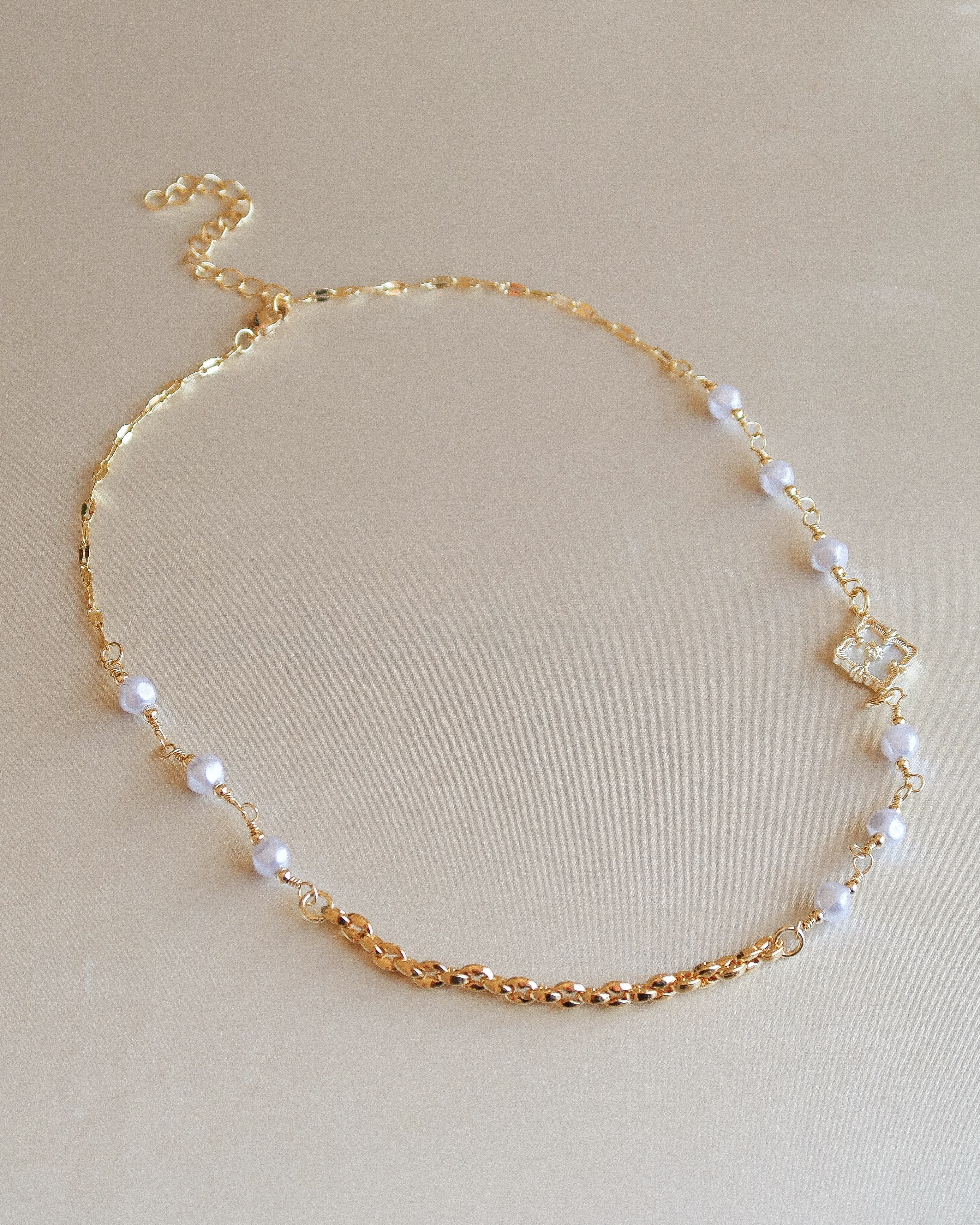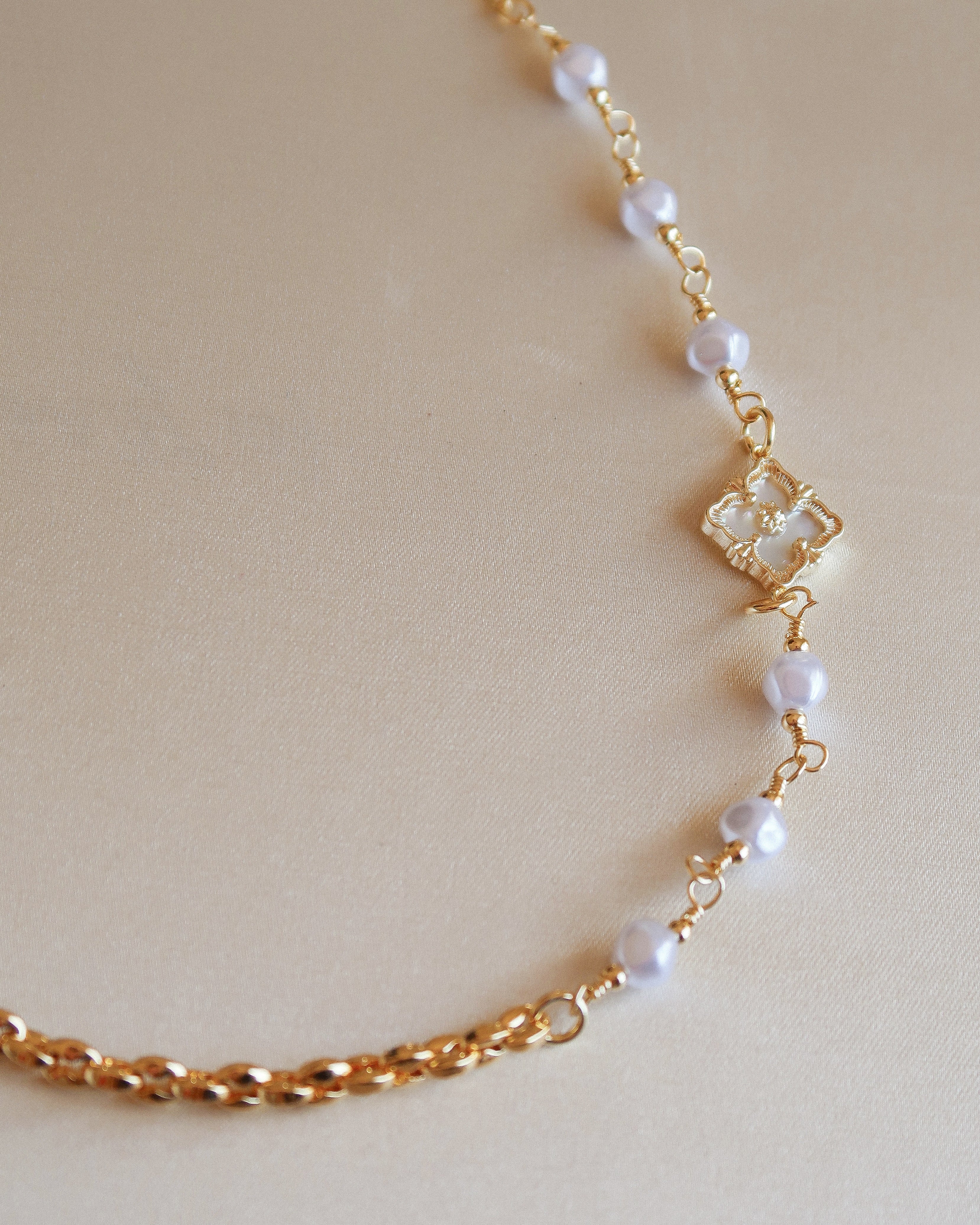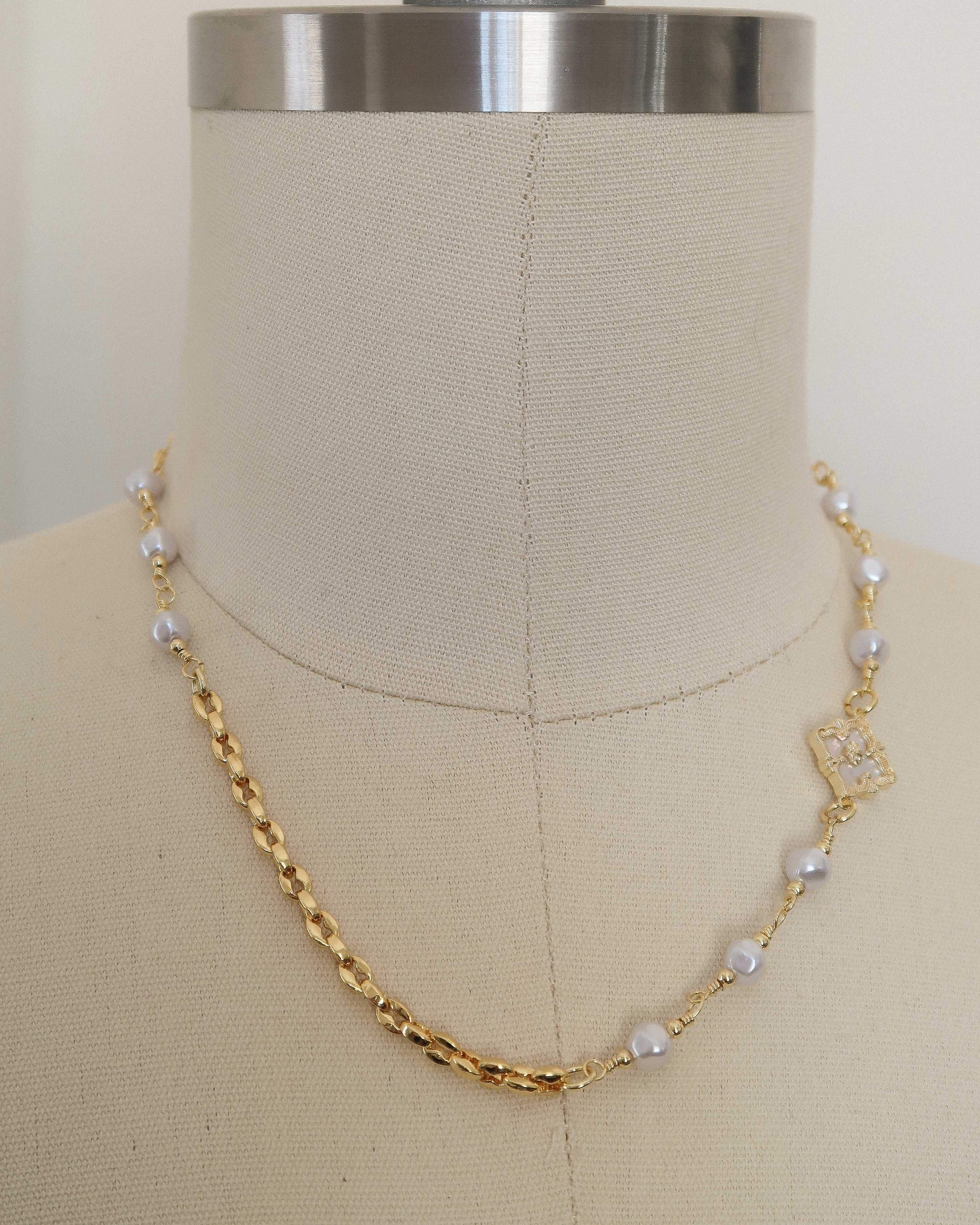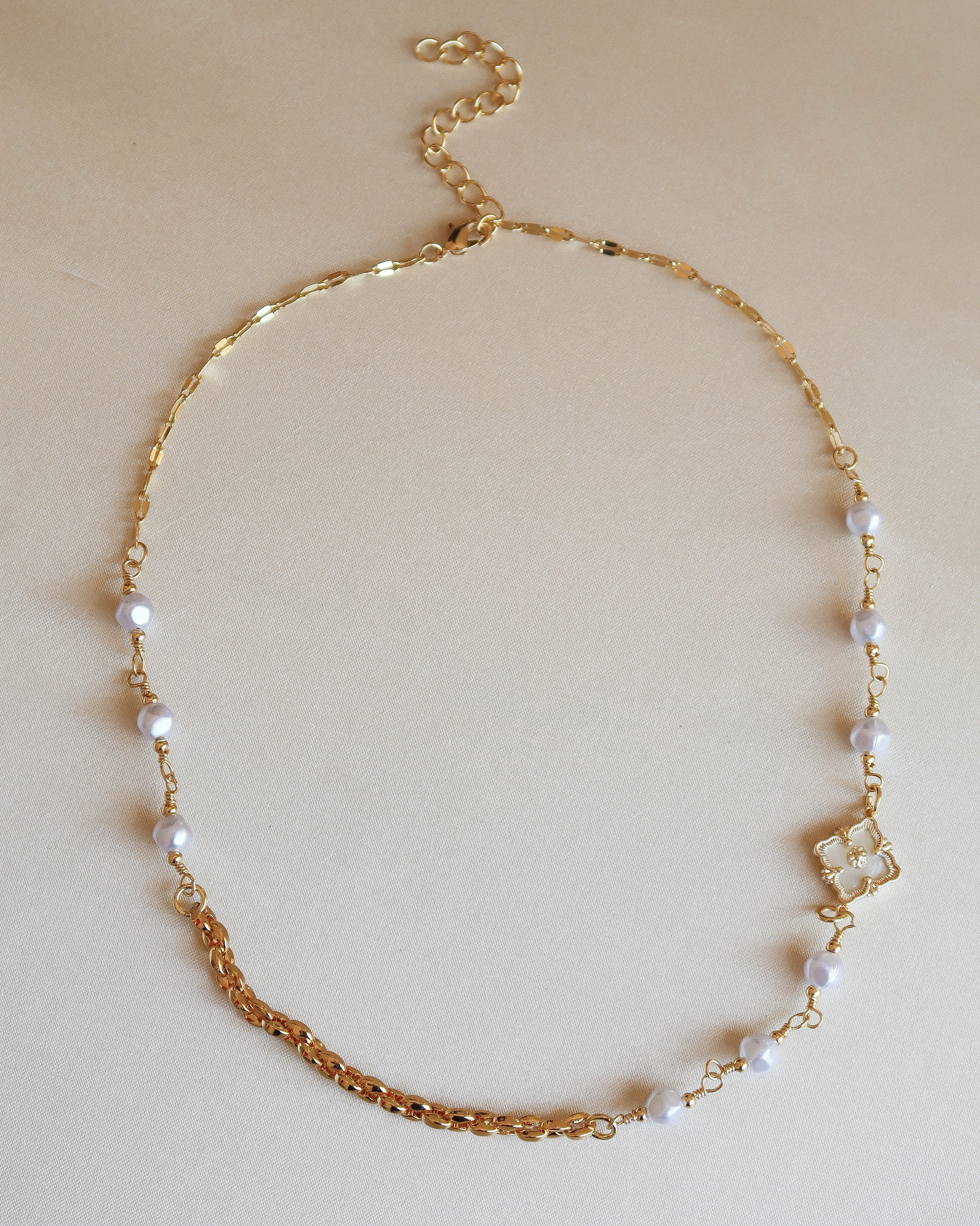 Each pearl is individually wire-wrapped for a soft, imperfect touch—balanced by the striking contrast of two gold chains: one classic, one reflective and bright. The flower charm glows with a pearlescent inlay, catching the light and drawing the eye.
