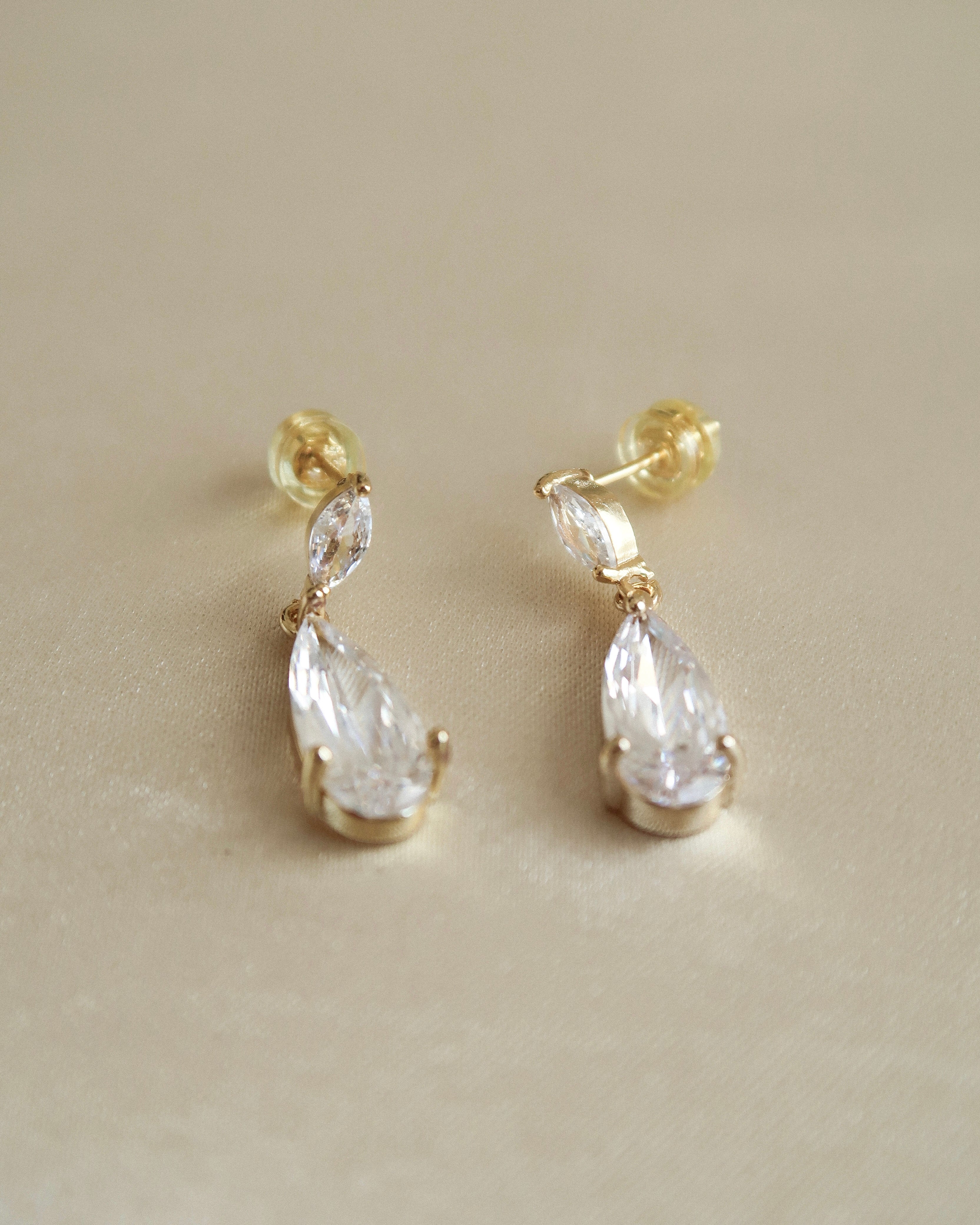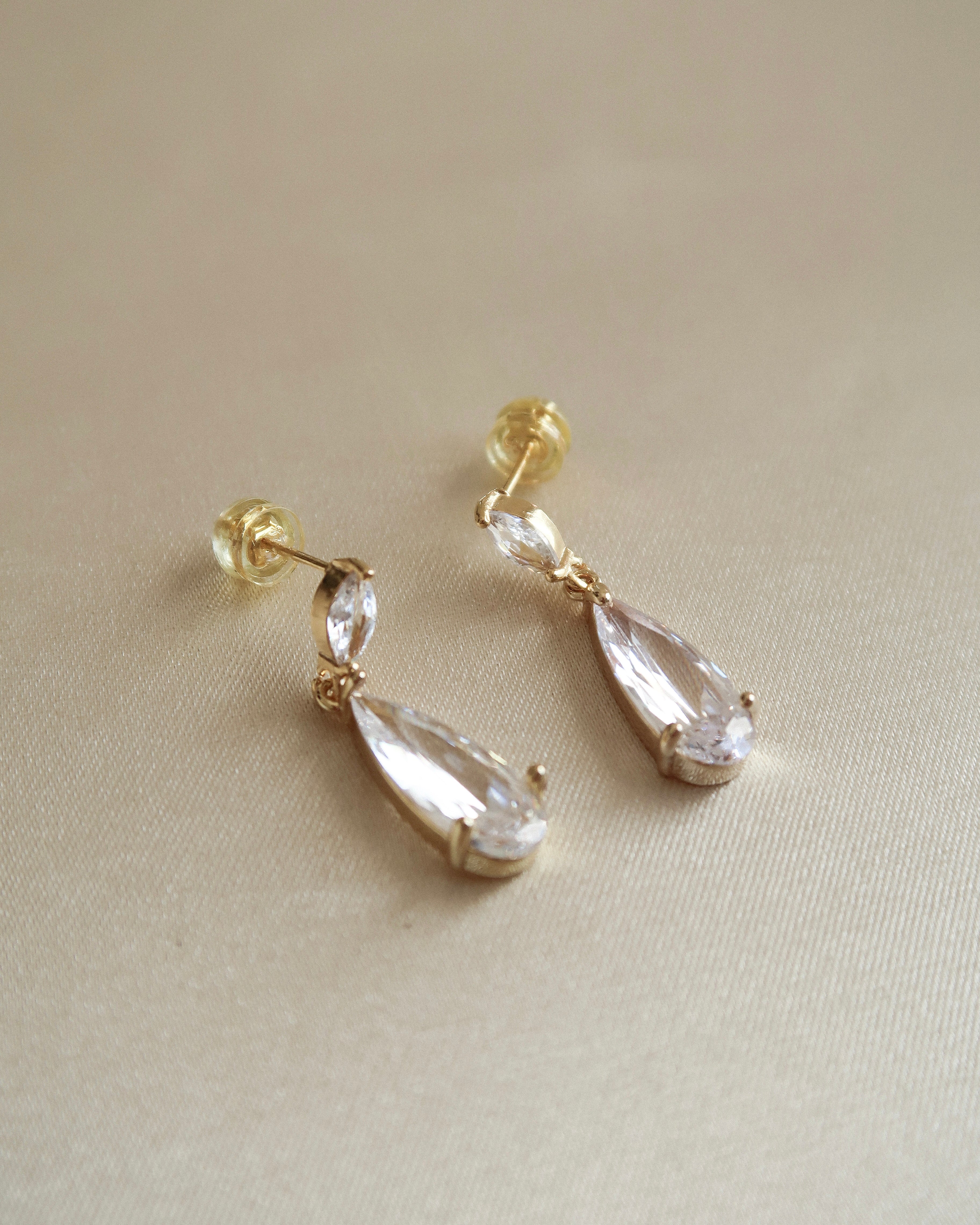 Crafted with 14k gold-filled posts and settings, these earrings feature a romantic marquise-cut stone suspended above a gleaming teardrop-shaped cubic zirconia. The delicate sparkle adds just the right amount of drama—soft, timeless, and unmistakably vintage-inspired.