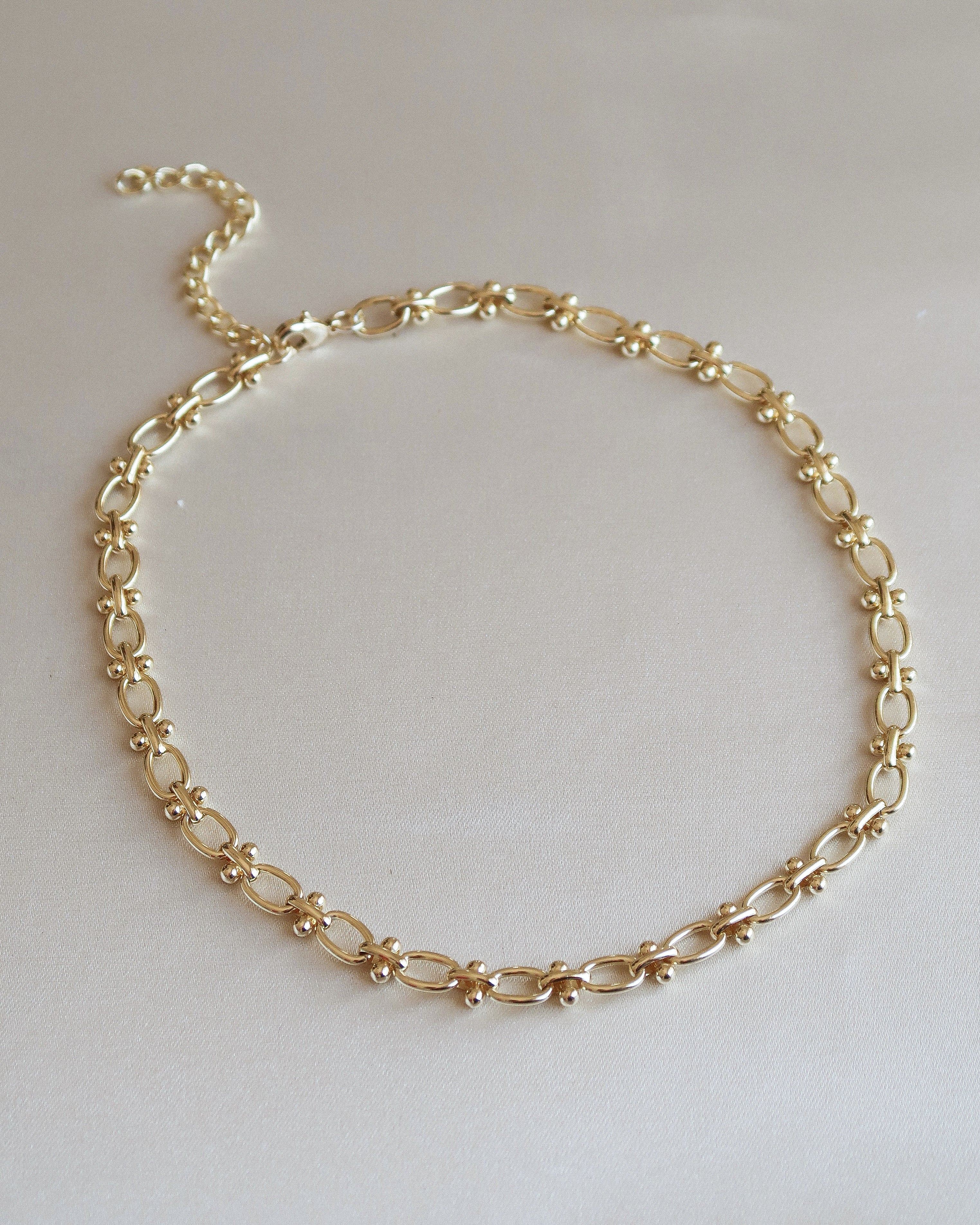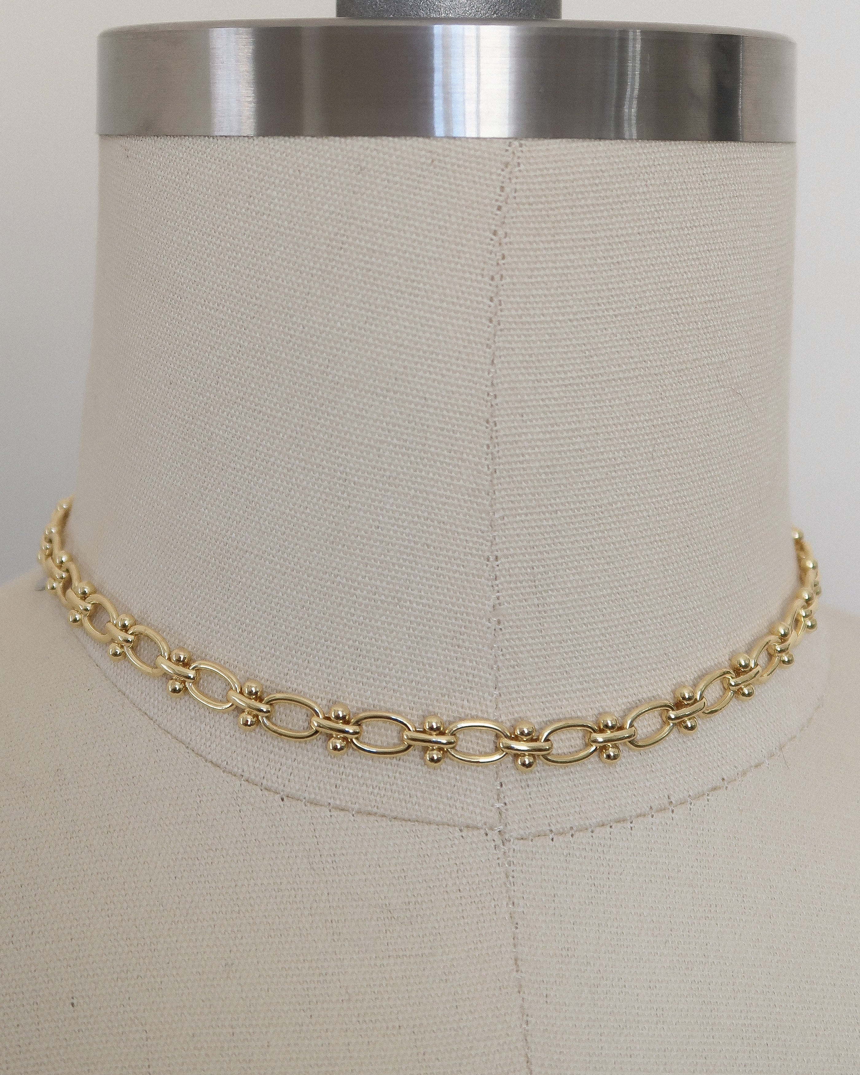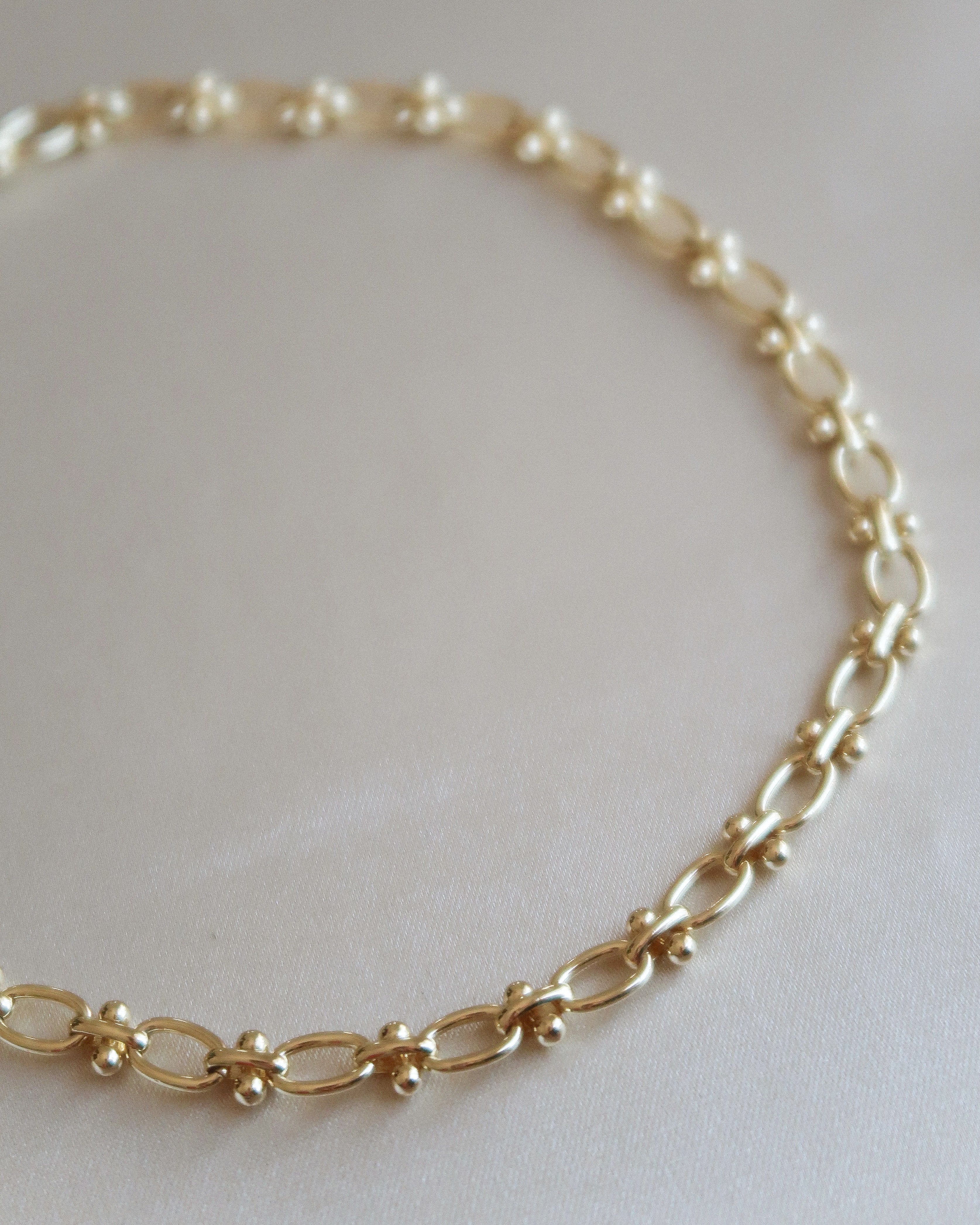 The Heirloom Choker is a vintage-inspired beauty that feels like it could’ve been passed down through generations. Featuring delicate oval links dotted with soft golden beads, this textured chain is finished in 18 karat gold over brass for a luminous, refined look.