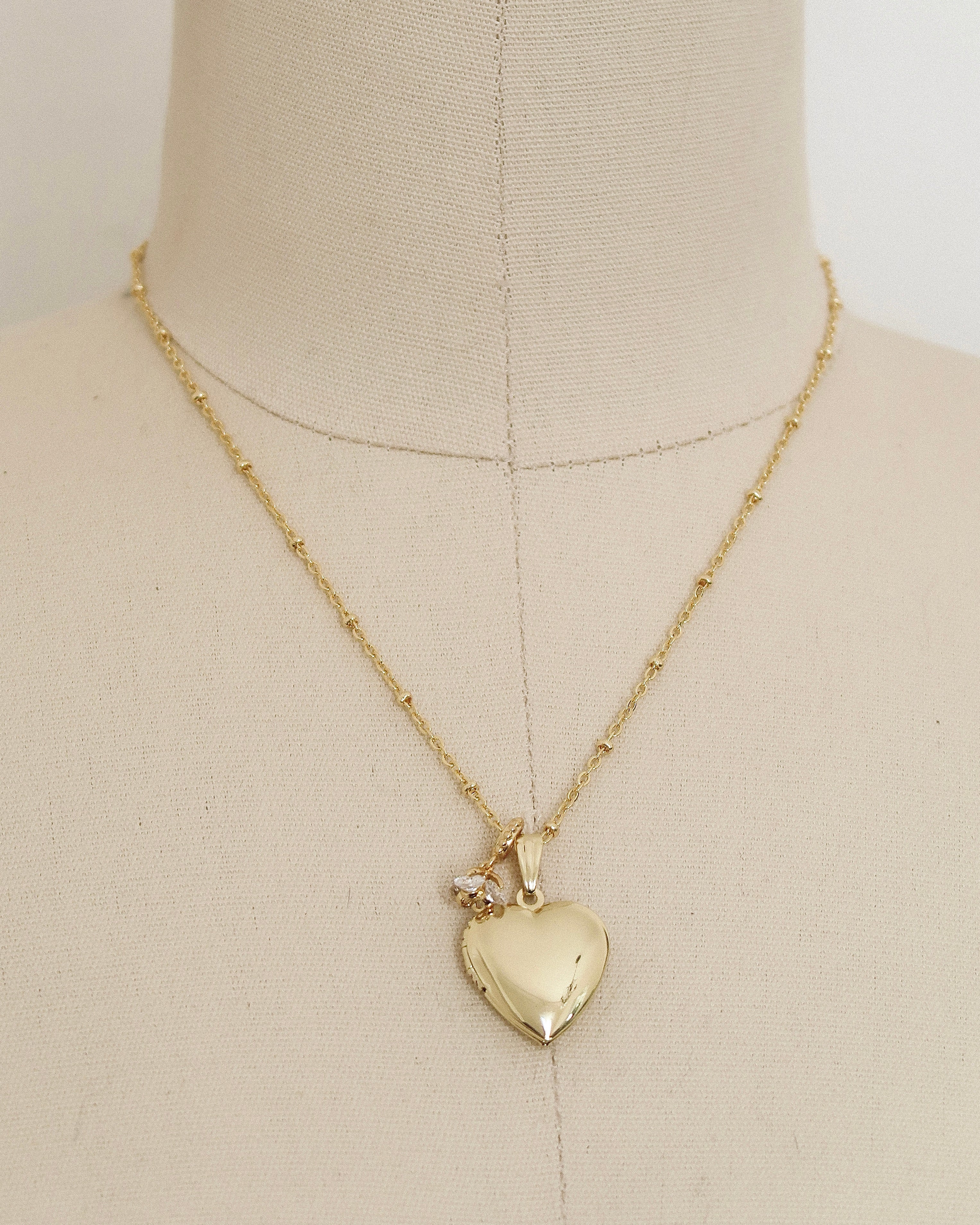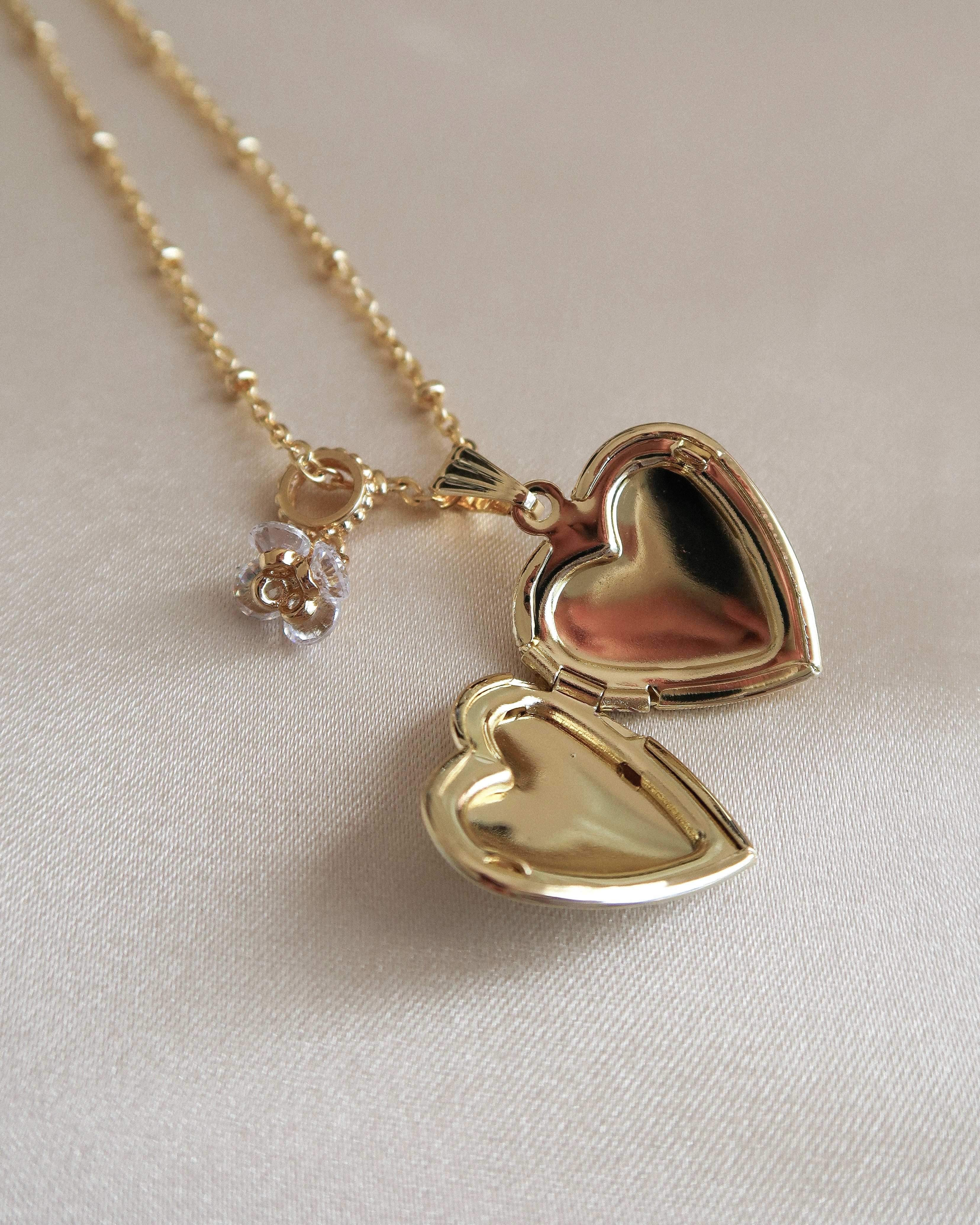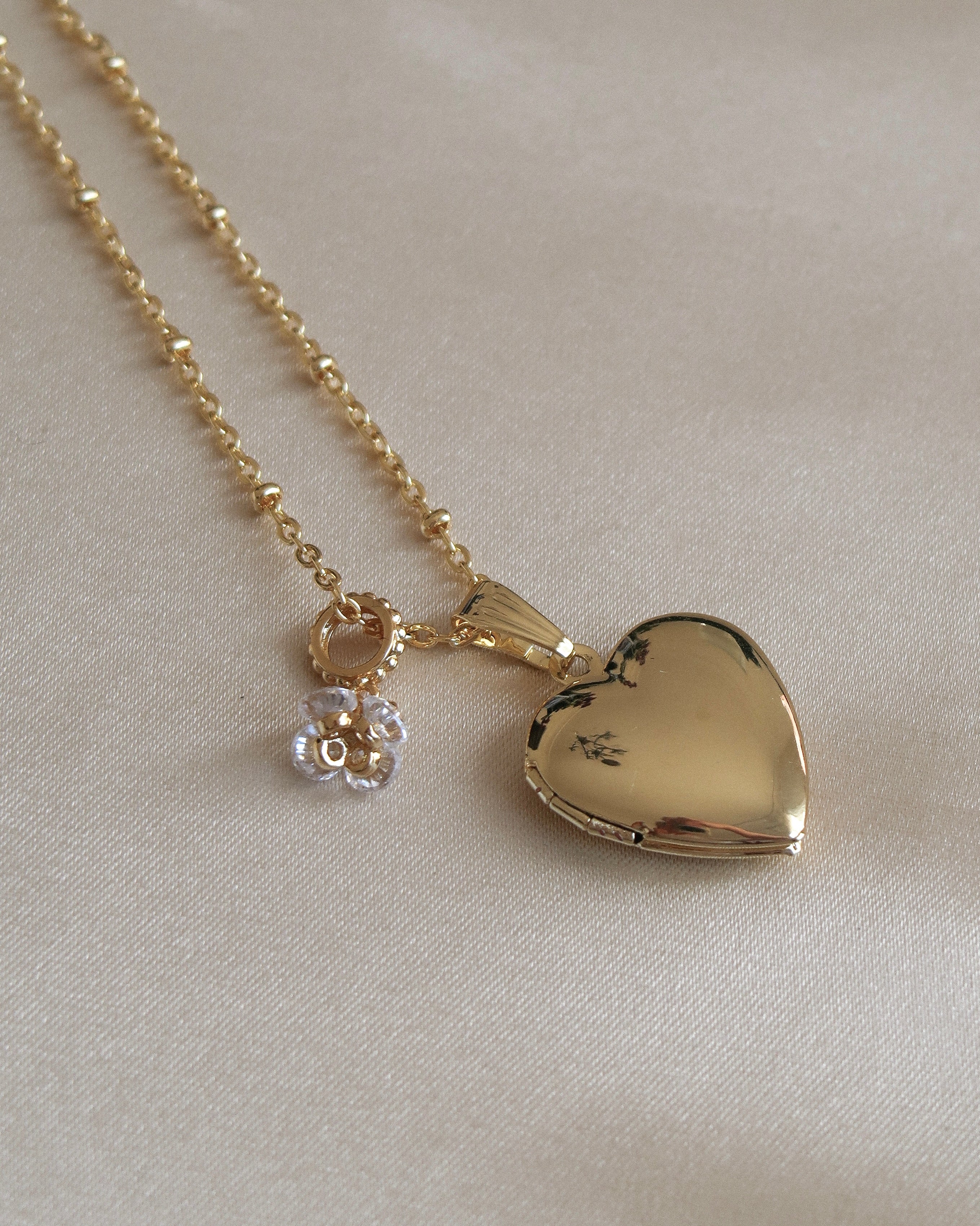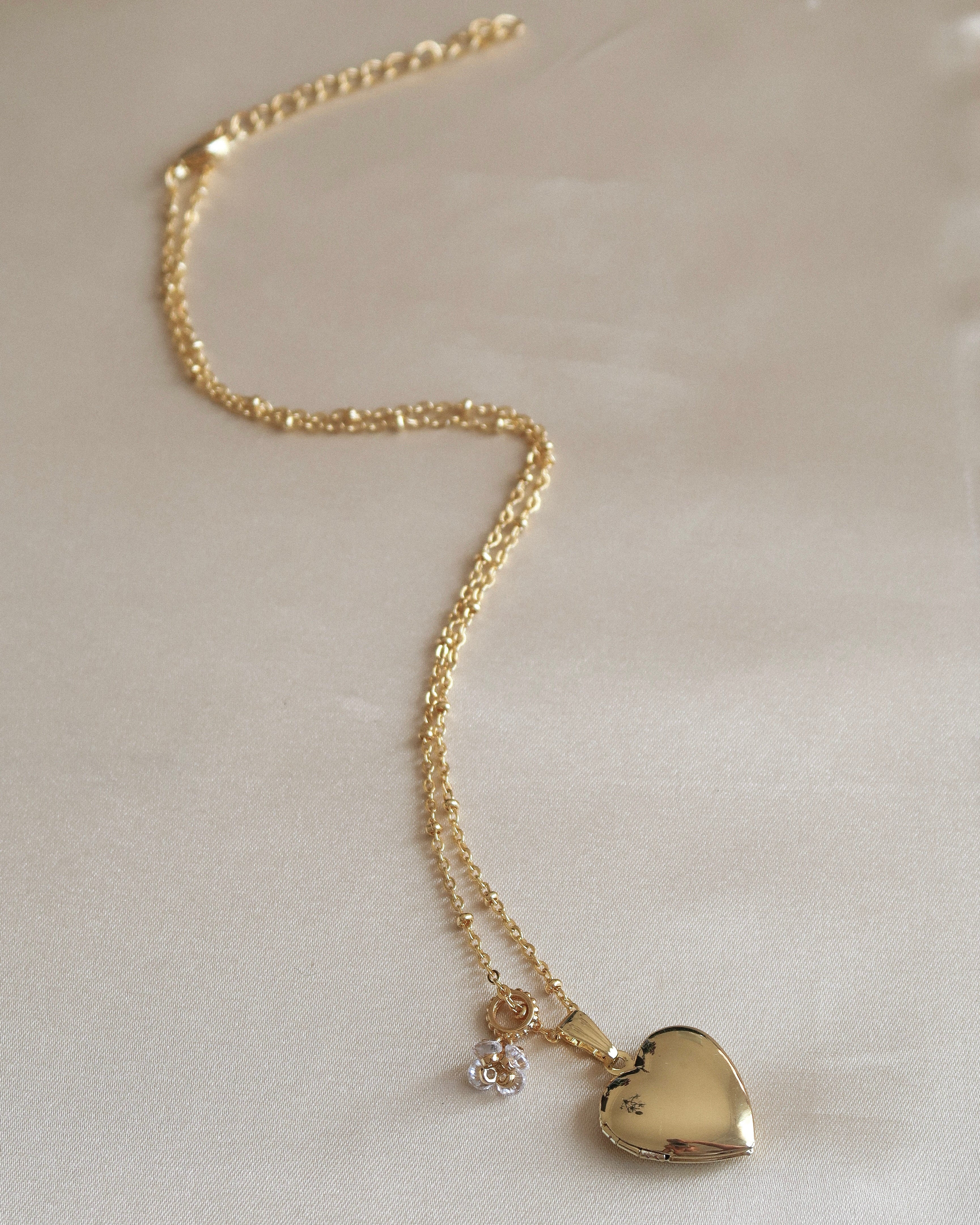 The Keepsake Locket is your daily heirloom—crafted with an 18k gold-plated stainless steel beaded chain, paired with a 14k gold-filled heart locket and crystal flower charm.