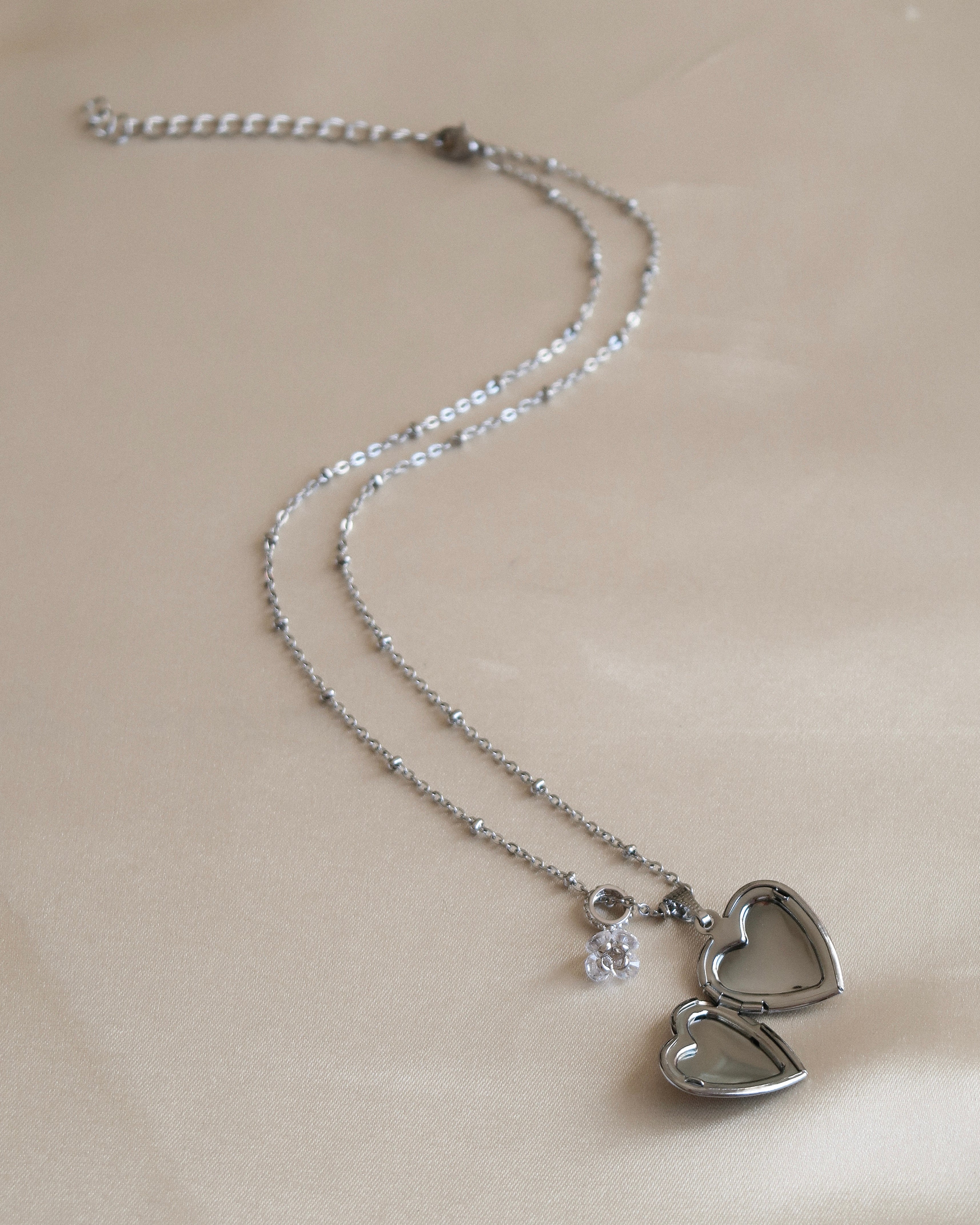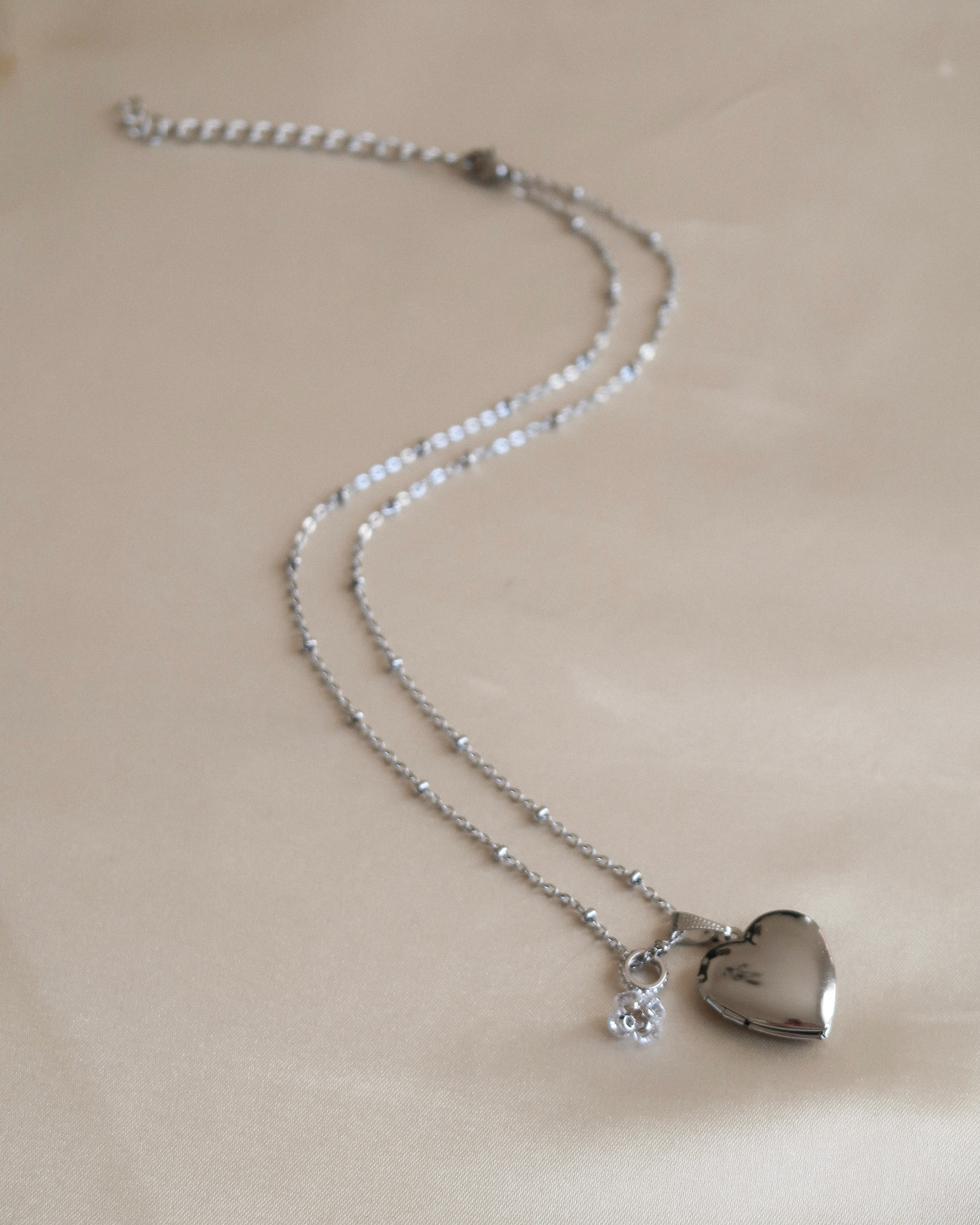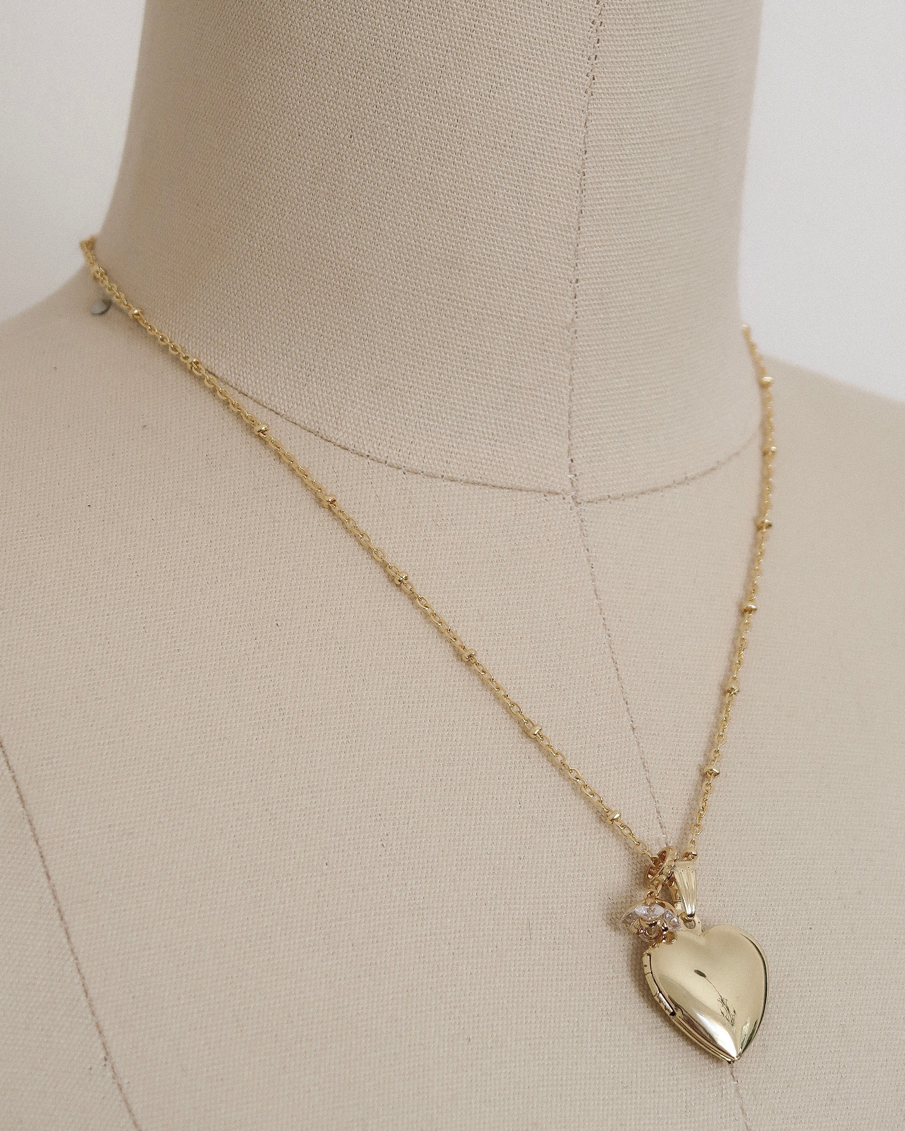 The Keepsake Locket is your daily heirloom—crafted with an 18k gold-plated stainless steel beaded chain, paired with a 14k gold-filled heart locket and crystal flower charm.