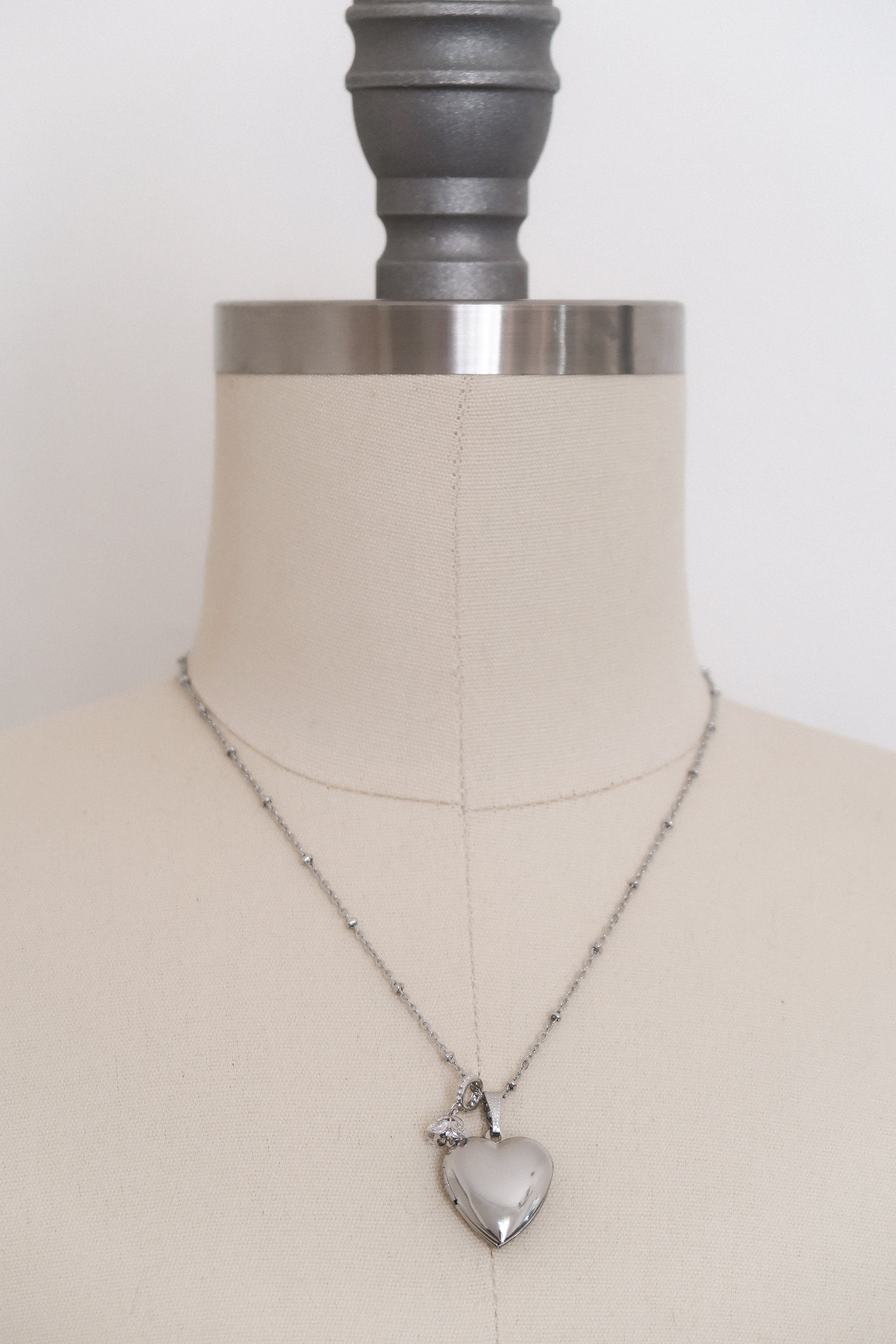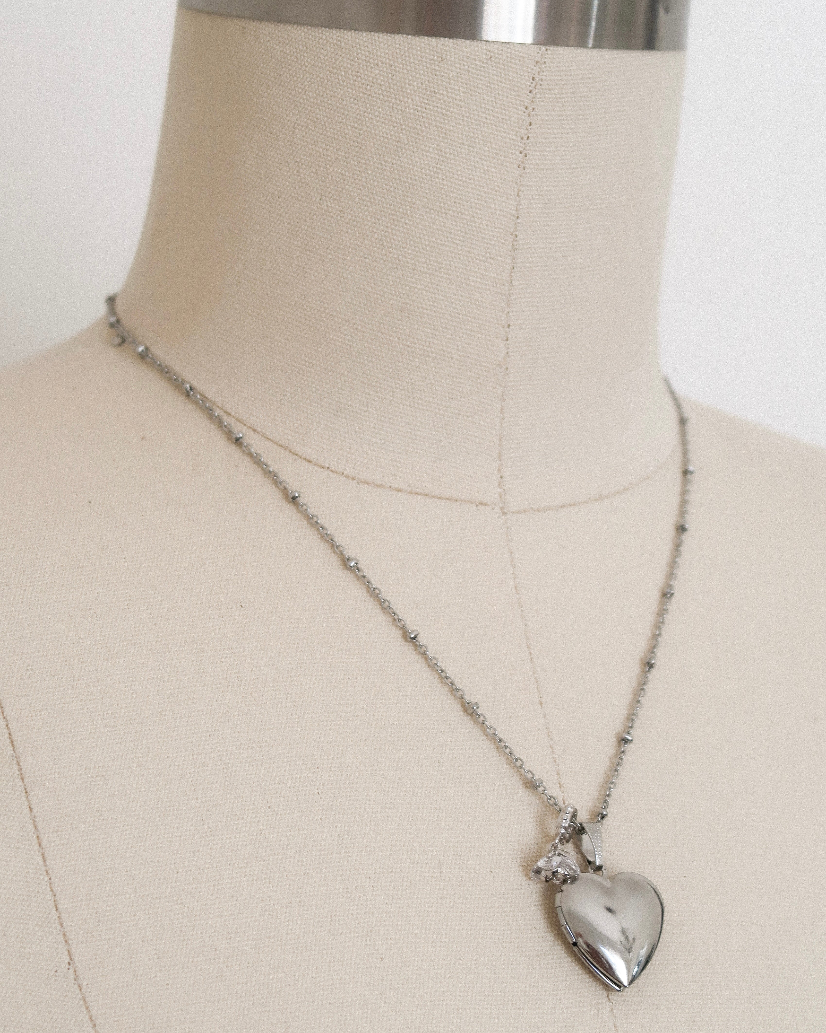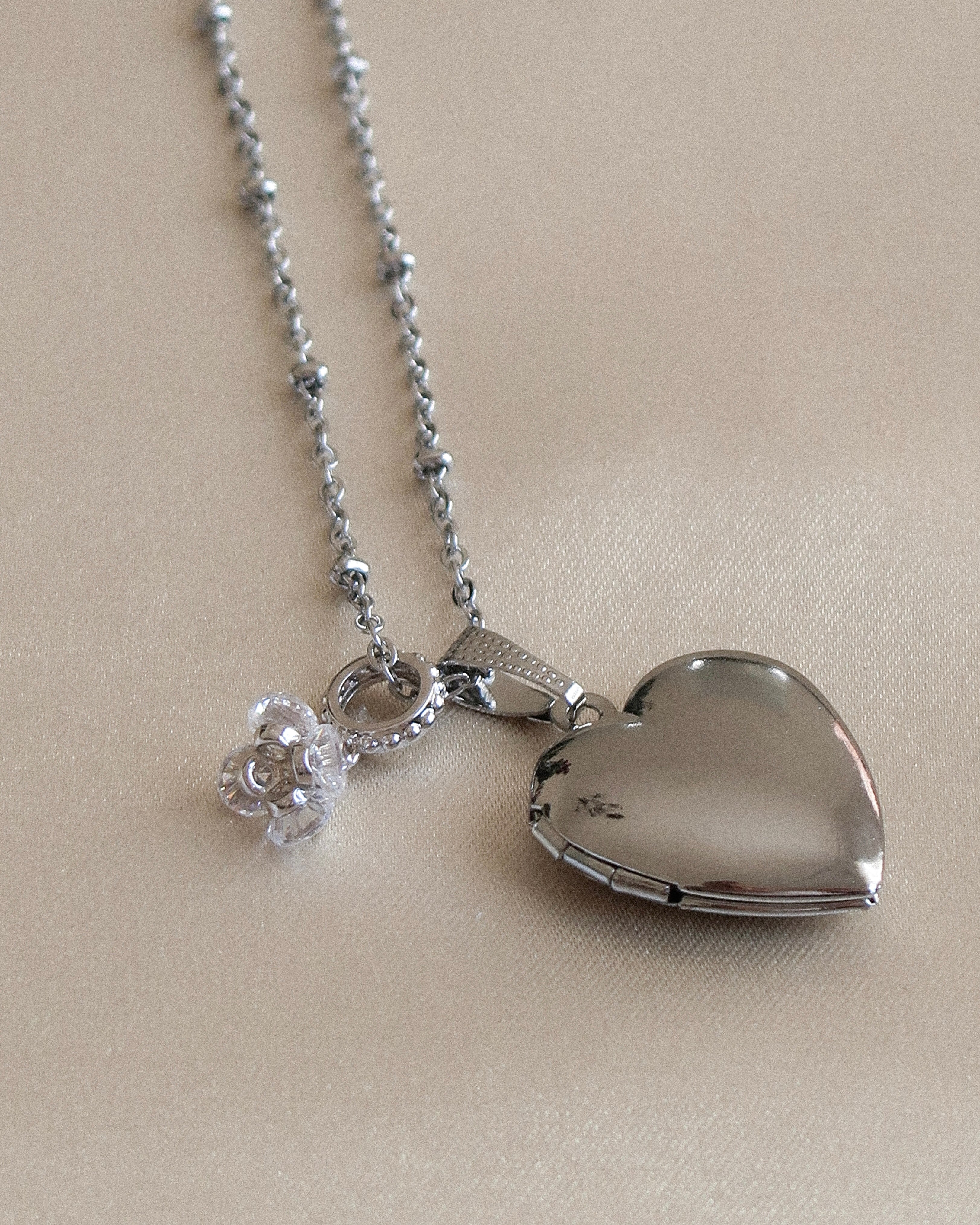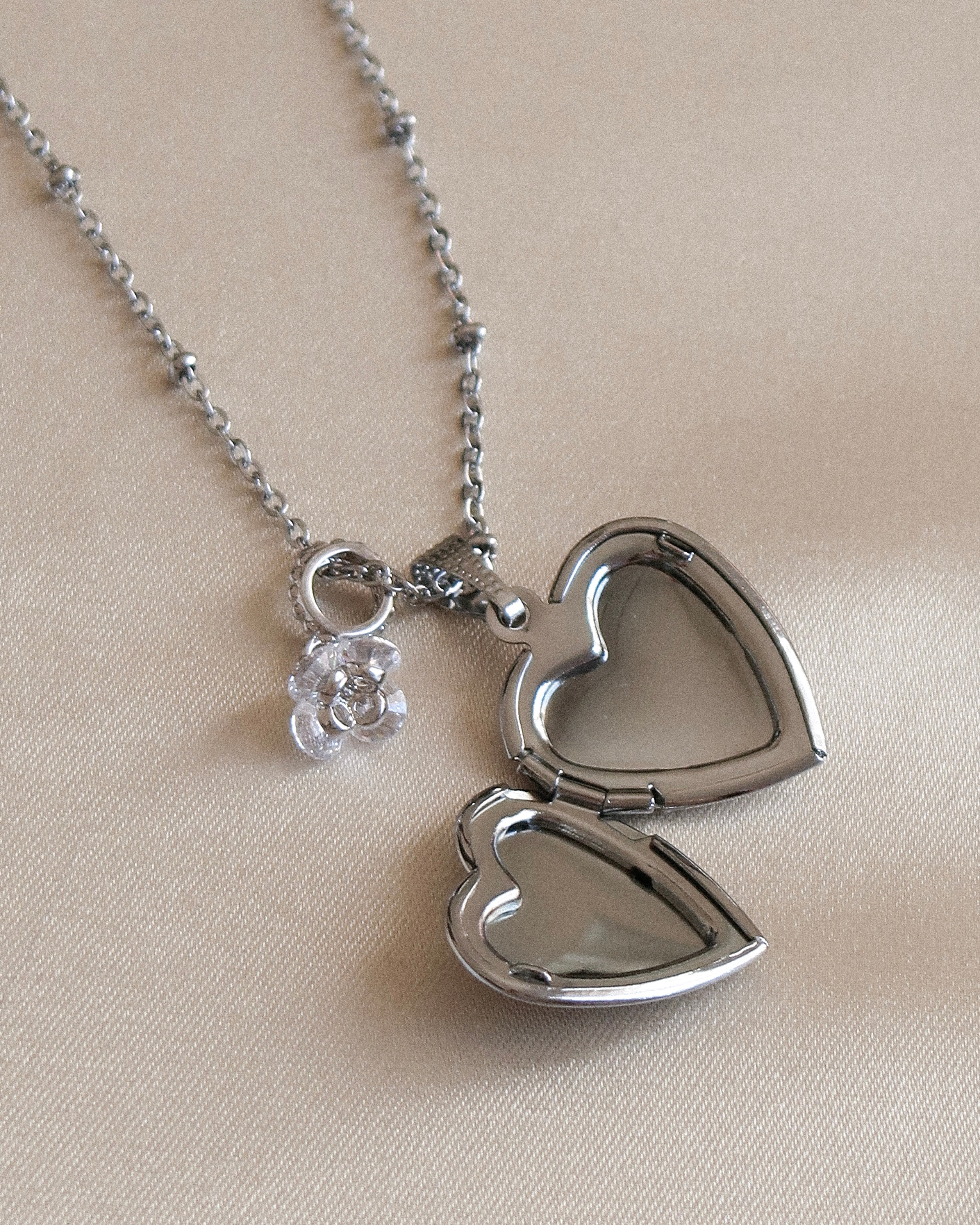 The Keepsake Locket is your daily heirloom—crafted with an 18k gold-plated stainless steel beaded chain, paired with a 14k gold-filled heart locket and crystal flower charm.